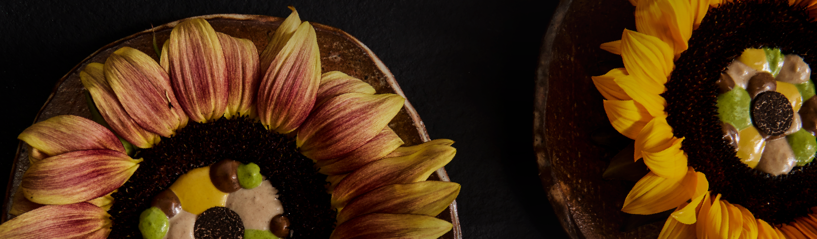 The fresh sunflowers are made into bisque; the kudzu root based dumplings are made from sunflower hearts. The salad is a symphony of sunflower – fresh kernels, roasted seeds, freshly pressed oil – garnished with fresh and sour corn and its petals.