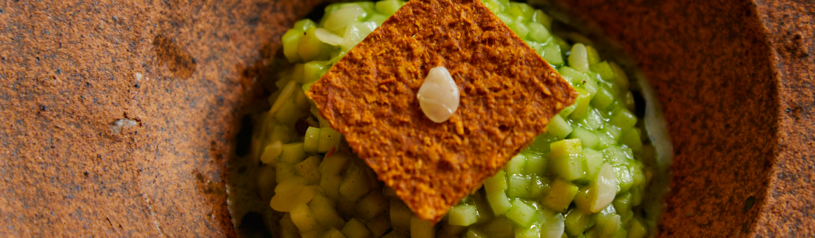 While the immediate stars of this dish – the shell made of dashima, a favored variety of Korean seaweed, sweet meat of Norwegian king crab, and the deep, savory mussel juice – it is balanced with treasures of the land. The acidity of the fermented mixed pepper balances the flavors of the mussels, and the tea made from foraged pineapple weed used in the finishing layer, balances out the flavors of the sea with those from the land.