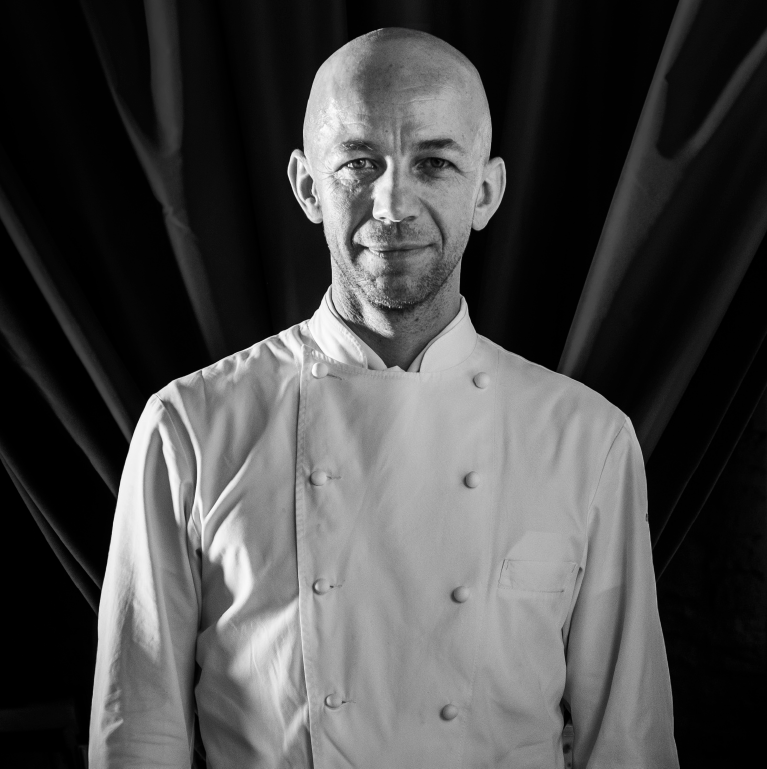 Semi-dried and grilled beetroot, served with razor clam, guanciale, and squid ink sauce